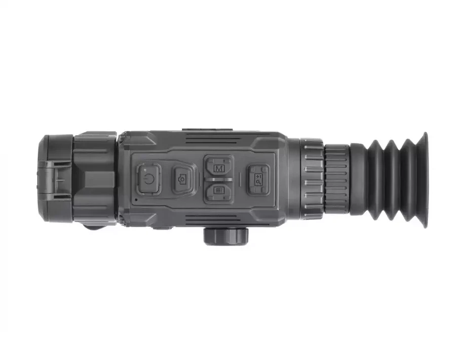 This thermal scope features a 35mm Germanium lens, a 640 × 512 resolution thermal sensor, and a 2x base magnification with a detection range of up to 1800 m/yd. Out of the two premium 640-resolution options, this thermal scope has a lower base magnification and a wider Field of View (12.5° × 10.0° or 65 ft @ 100 yds) providing extensive area coverage while scanning